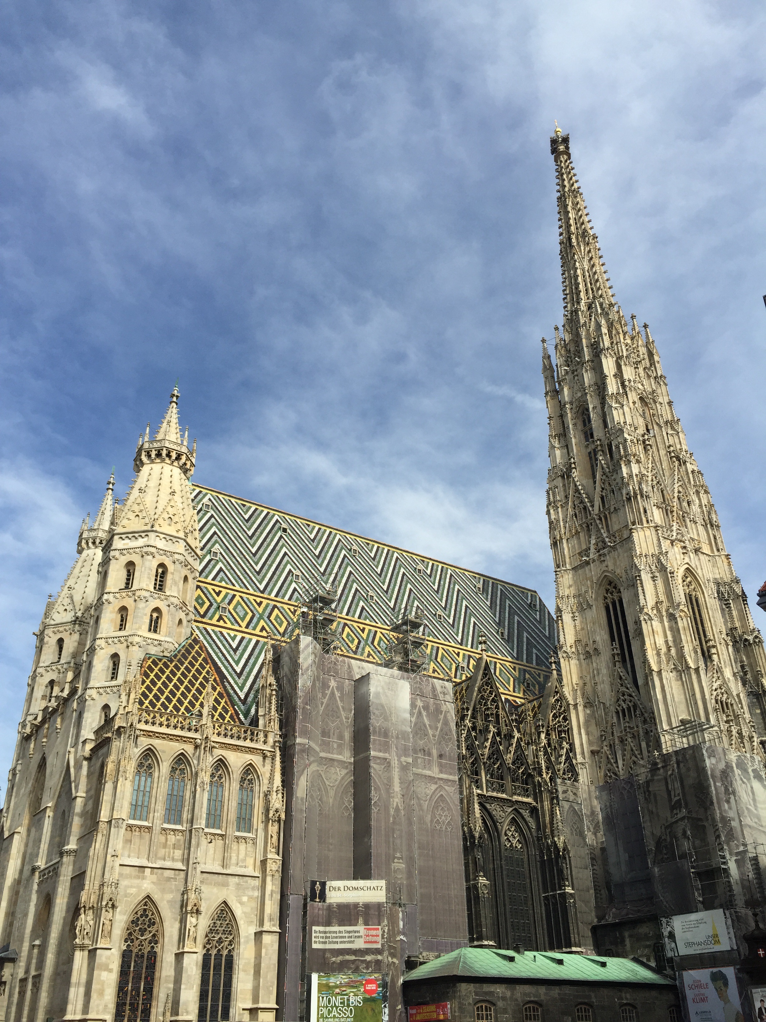 What fun to wonder these streets! Almost every building has ornately decorated facades with stunning statues regularly punctuating the streets. And narrow streets with buildings hugging the sidewalks. Then I turned a corner and WOW! There was a magnificent, spired church that pierced the skyline! It’s St. Stephan’s Cathedral–a thing of beauty.