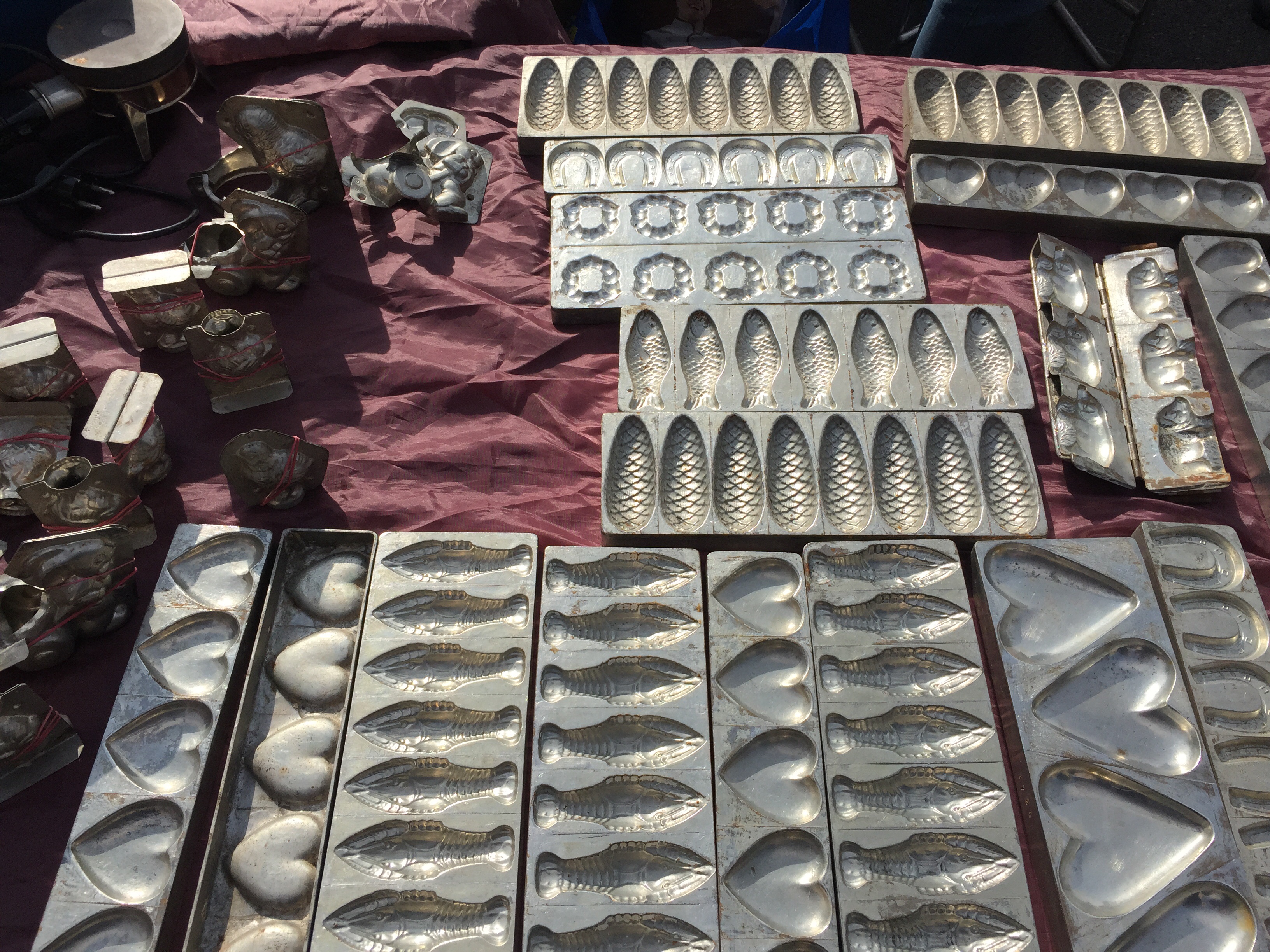 Maybe my favorite post yet. A wonderful way to end. You have the best flea market eye and I would love to have followed you as you sift through and find the great stuff. I love the stamps, the old linens, the old hardware, and the candy molds. (passing on the lederhosen) I still have my gigantic egg chocolate molds I got in Auburn, so we have Easter and Valentine’s covered between us. Susan will do something fabulous with the wallpaper rollers.