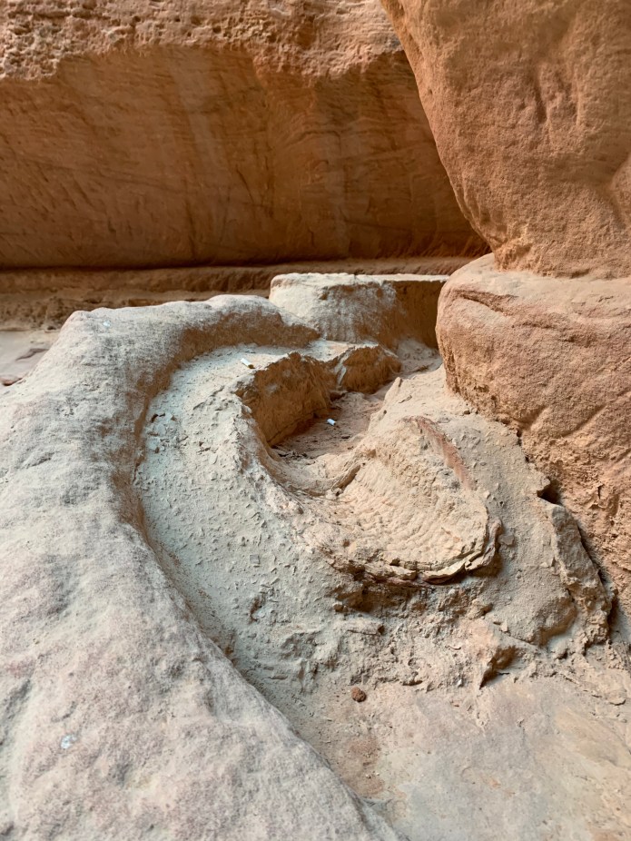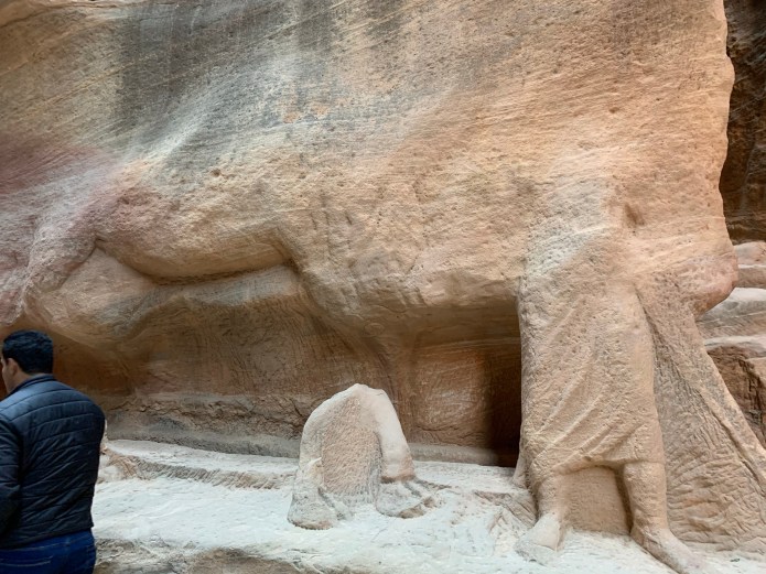 The Nabataeans probably built Petra as the capital of their kingdom in the 4th century B.C. Petra is approached by walking through a slot canyon about a kilometer in length. The geology is fascinating, and I was surprised when Wasfi, our tour guide, showed remnants of elaborate carvings in the walls. The narrow gorge was used by the Nabateans to harness rain water in an elaborate system of structures channeling the water into clay pipes.