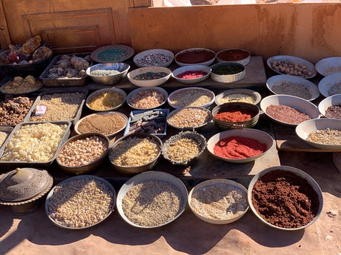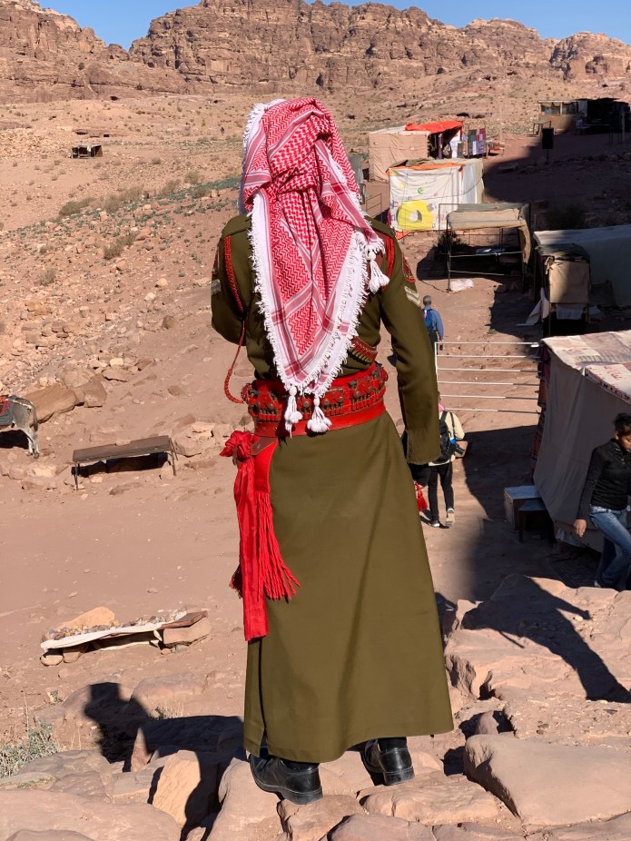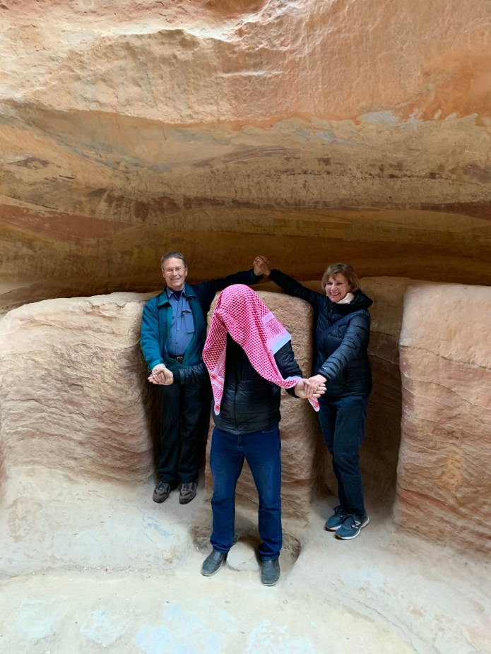 There are vendors all over Petra. We enjoyed several stops. One merchant sells frankincense and myrrh. Another demonstrated how to use the black kohl Bedouins use to line their eyes. We met the woman who wrote “I Married A Bedouin”. I bought a pair of earrings from her that have three bars and a circle. This pattern can be seen on buildings in Petra, including the Monastery. It’s used as a border and symbolizes birth, life, death, with the circle representing eternity.