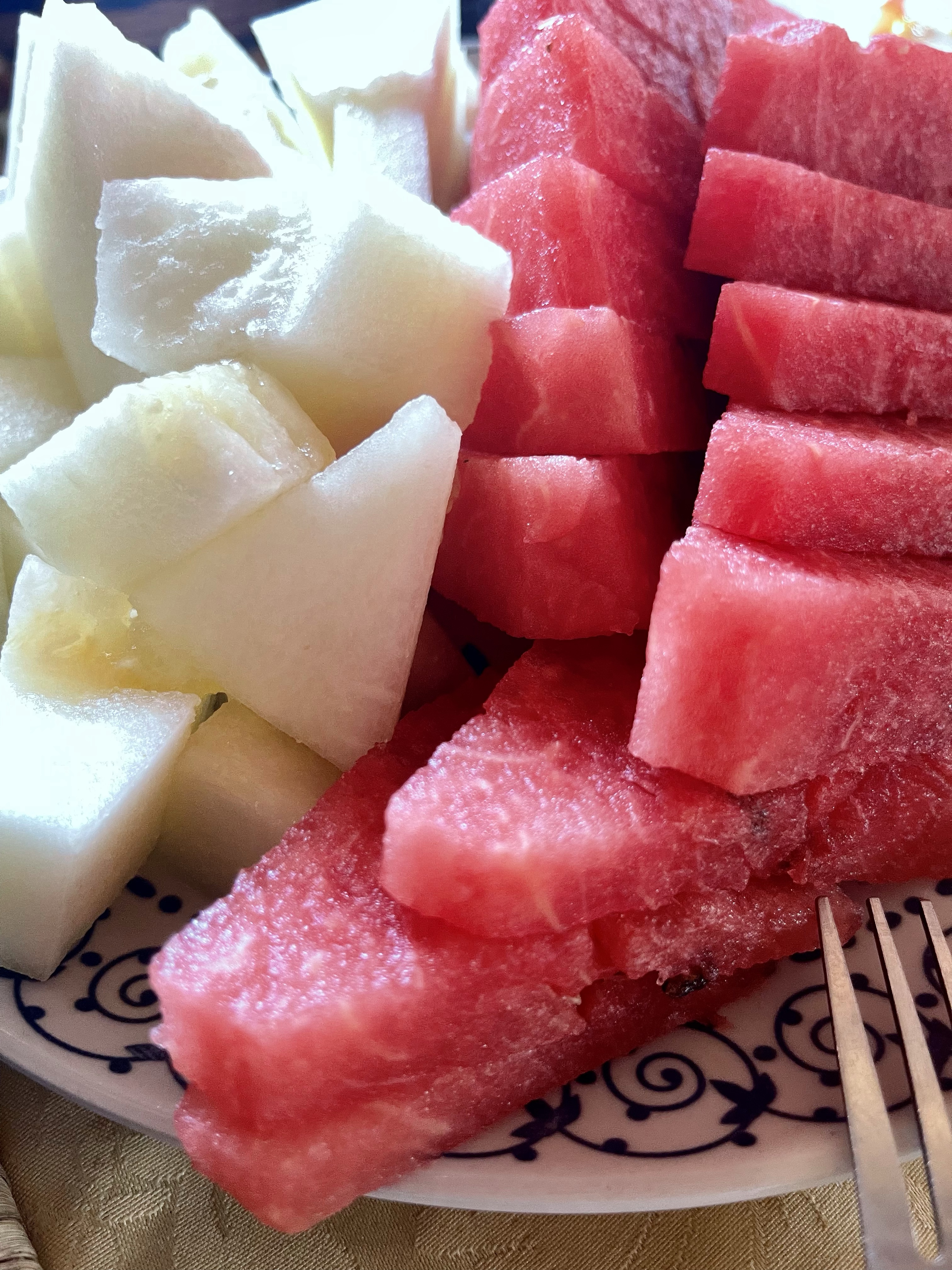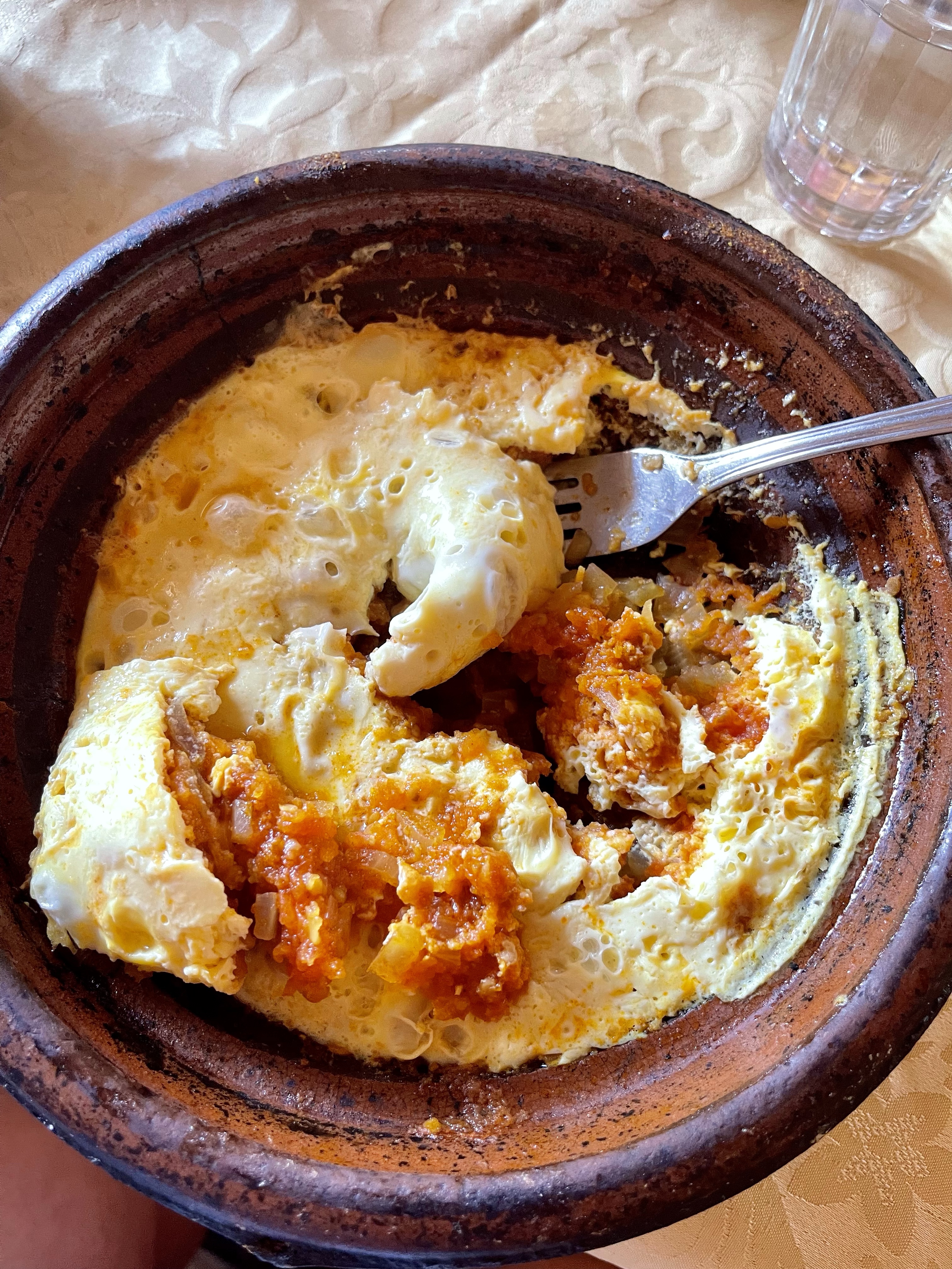 The meals we enjoyed during our stay featured local food that the Berbers eat. The fresh salad they serve is reminiscent of bruschetta or salsa, and we greedily scooped it up with the homemade bread. One of our meals was a Berber omelette, which hid savory tomatoes and onions beneath the eggs. We enjoyed a Turkey dish that had eggs on top. Eggs seem to be an important part of the diet. Dessert is always fruit, and the ambrosial watermelon reminds me of seeded watermelon of my youth. The flavor seems superior to seedless melons.