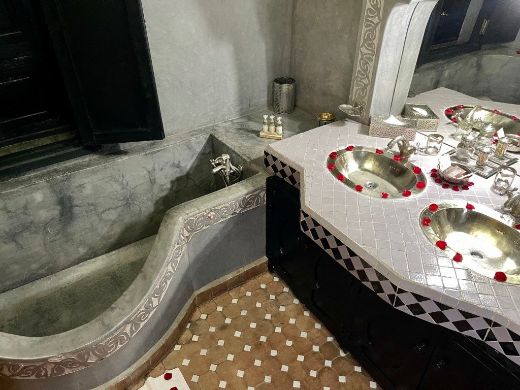 Well, now I understand why staying in a Moroccan “riad” in Marrakech is such a big deal! Whitney and I entered Riad & Spa le Secret de Zoraida, and our jaws dropped. The sumptuous interior space–ours has a pool–spoke peace to our travel weary souls. The calm space belied the frenzied Medina streets beyond the door.