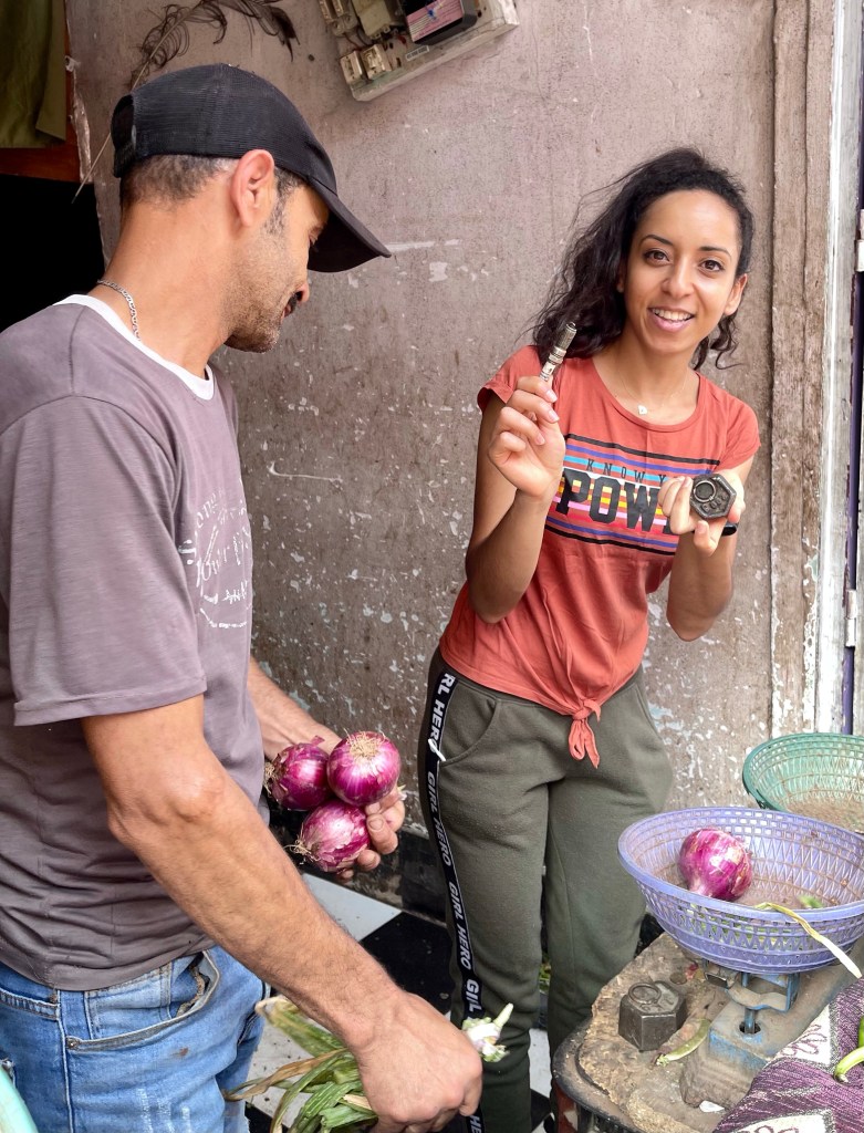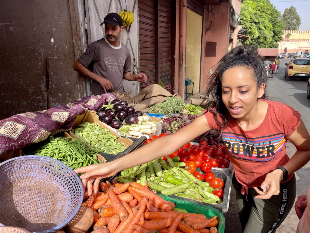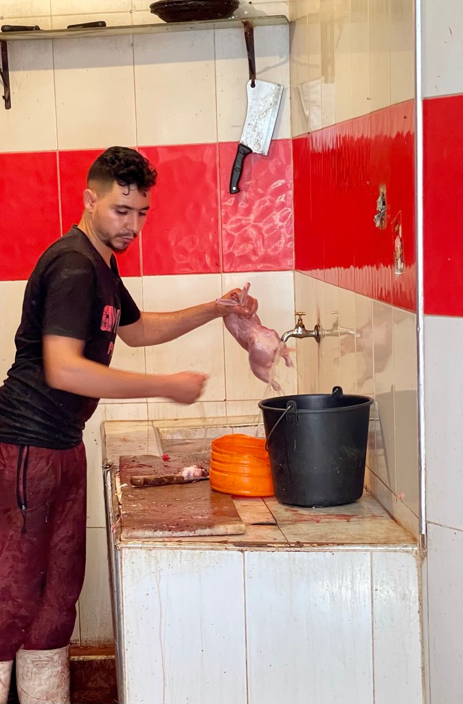 Besides relaxing in the pool, we were interested in taking a cooking class. We hit the jackpot when we selected an Airbnb experience with Najlae. We met her close to her home in the medina to gather produce and meat for our meal. She explained as we selected produce that haggling is always a part of the purchase, even with these vendors she shops with daily. The chickens are alive because you can make sure you’re getting a healthy one. So we watched the butcher kill the chicken, clean the chicken, and skin the chicken!
