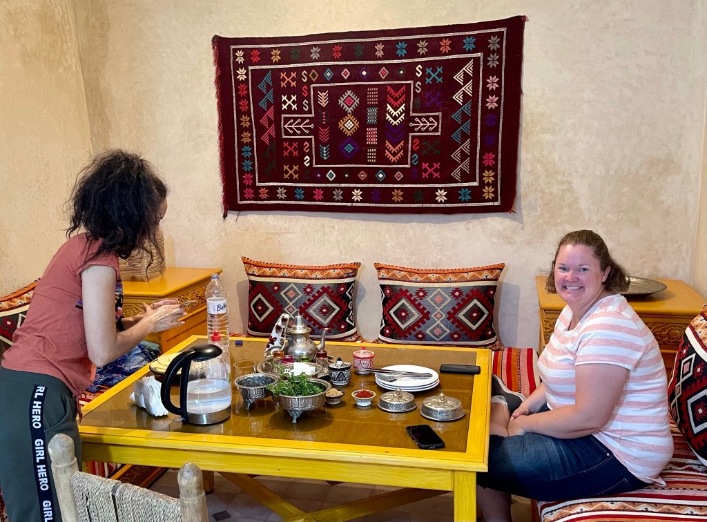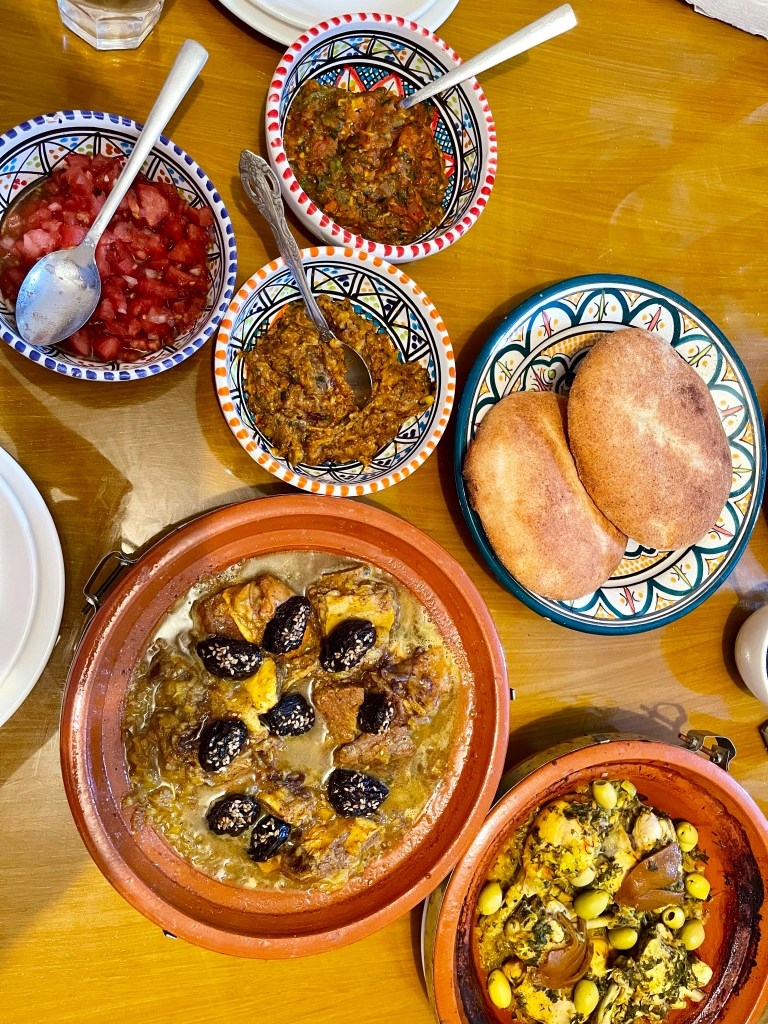 Before I knew it, we were sitting down to a splendid meal! We’d made Whitney’s favorite salad, the aubergine salad; my favorite, the tomato and grilled pepper; and the traditional Moroccan salad, finely chopped tomato and onion. The bread was perfect for scooping the salads. Najlae added the final touches: olives to the chicken and lemon tagine, and a drizzle of the prune syrup over the wedding tagine. The flavors were absolutely delicious–winning combinations.