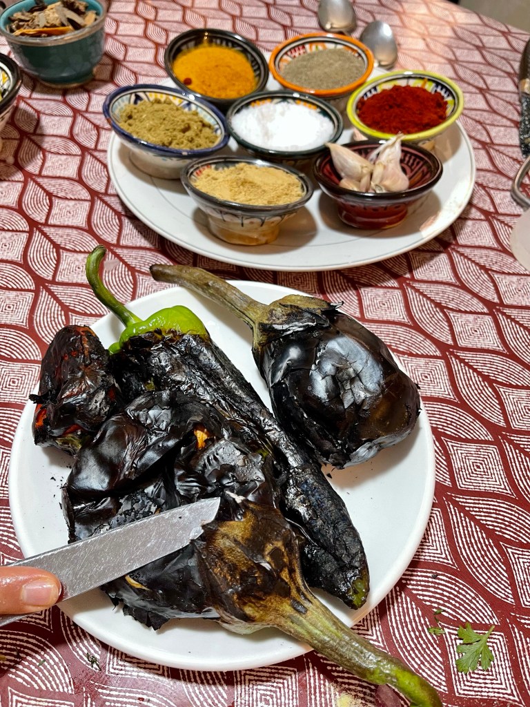 Najlae was extremely knowledgeable. She instructed us on Moroccan spices and the specific uses for each spice. She showed us how to char the eggplant and peppers for the vegetable salads. We made a “wedding” tagine (used for special occasions) with beef and prunes (apricots and figs may also be used–no vegetables because they don’t mix fruit and vegetables). We also made chicken with preserved lemons–my favorite. We used preserved lemons Najlae made two years ago. They evidently improve with age!