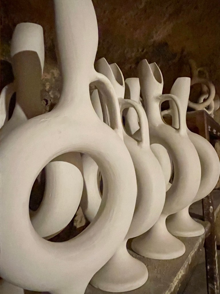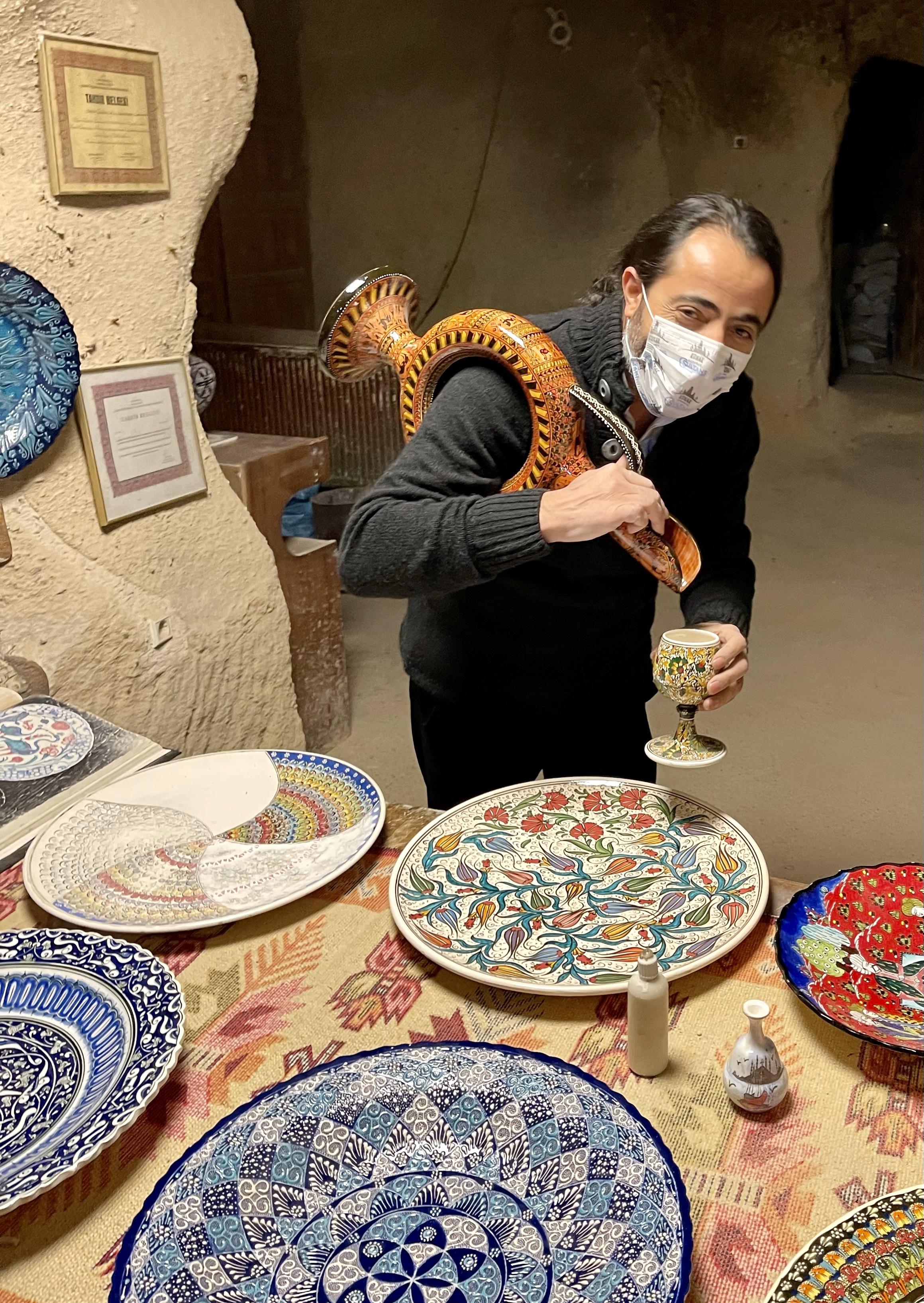 These flasks were originally designed by the Hittites, who established an empire in Anatolia around 1650 BC. They were designed to conveniently serve wine with the flask resting on your shoulder. We visited a famous pottery studio situated in caves, like so many structures in Cappadocia. The owner’s family has been there over two hundred years! The potter molded the entire flask from a single lump of clay. I couldn’t figure out how the middle cylindrical piece would be formed until he created it! And the wheel was not electric–he manually kicked it–which requires so much skill.