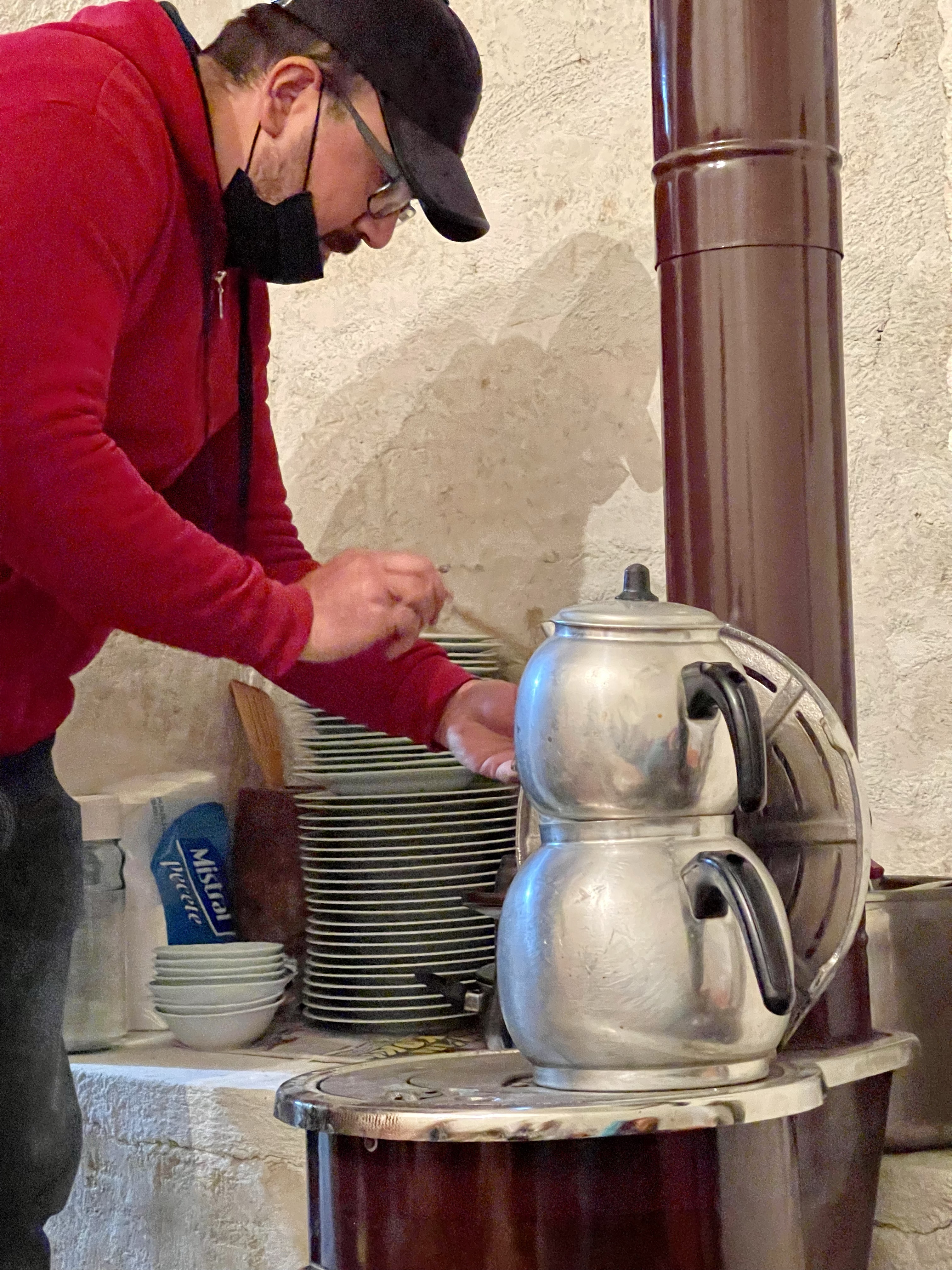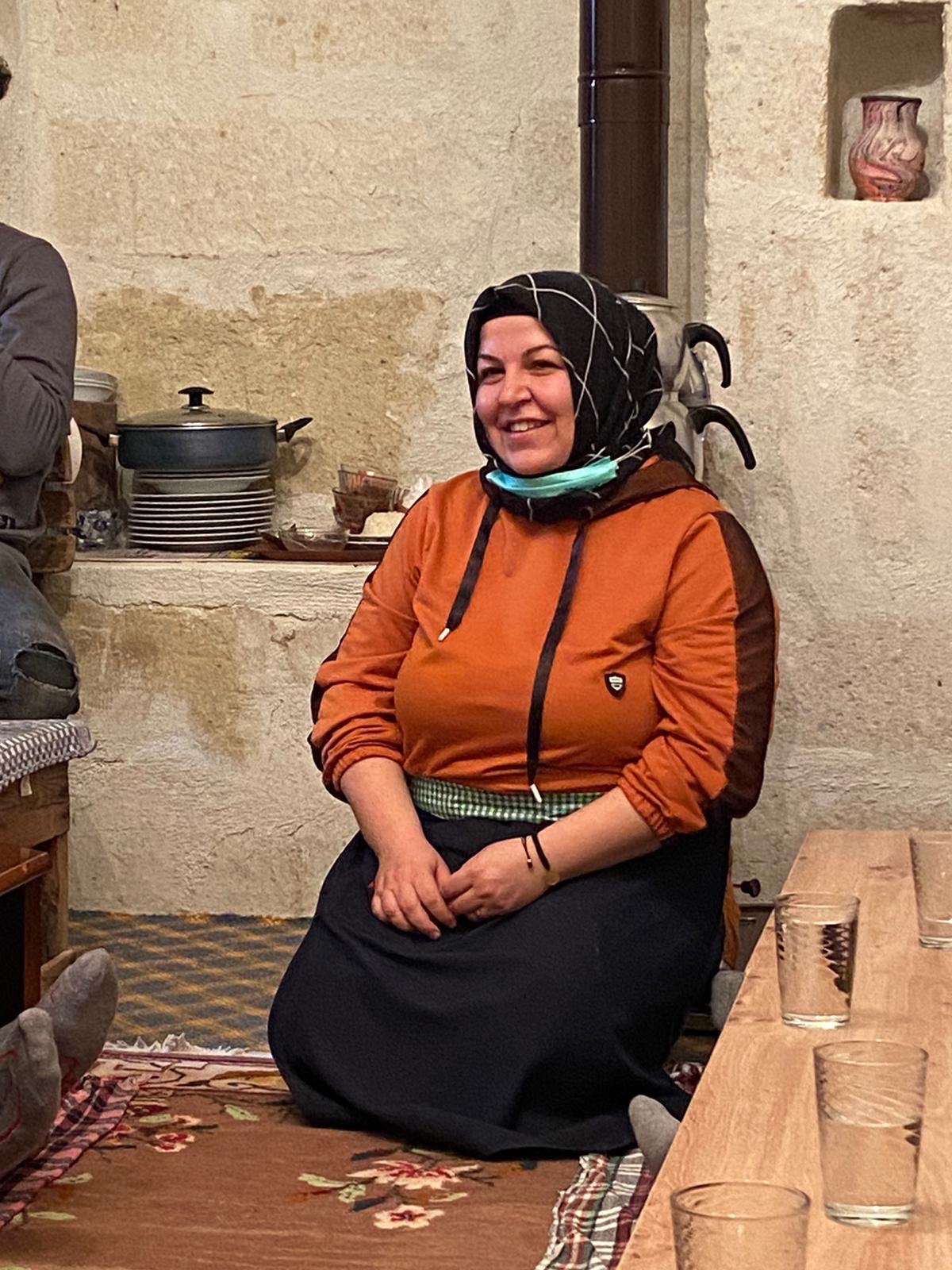 The tea is brewed in the top pot and water is brewed in the bottom pot because the tea is so strong. Hot water is added to the tea when served. These pictures were taken when we had dinner with a local family in Cappadocia. They served us tomato soup, salad, beans, sliced eggplant stuffed with meat, and fruit compote with grapes from their own vines. Their marriage was arranged, and the bride’s mother had woven a carpet as part of the brides dowry, which is a tradition! They were a lovely, generous family.
