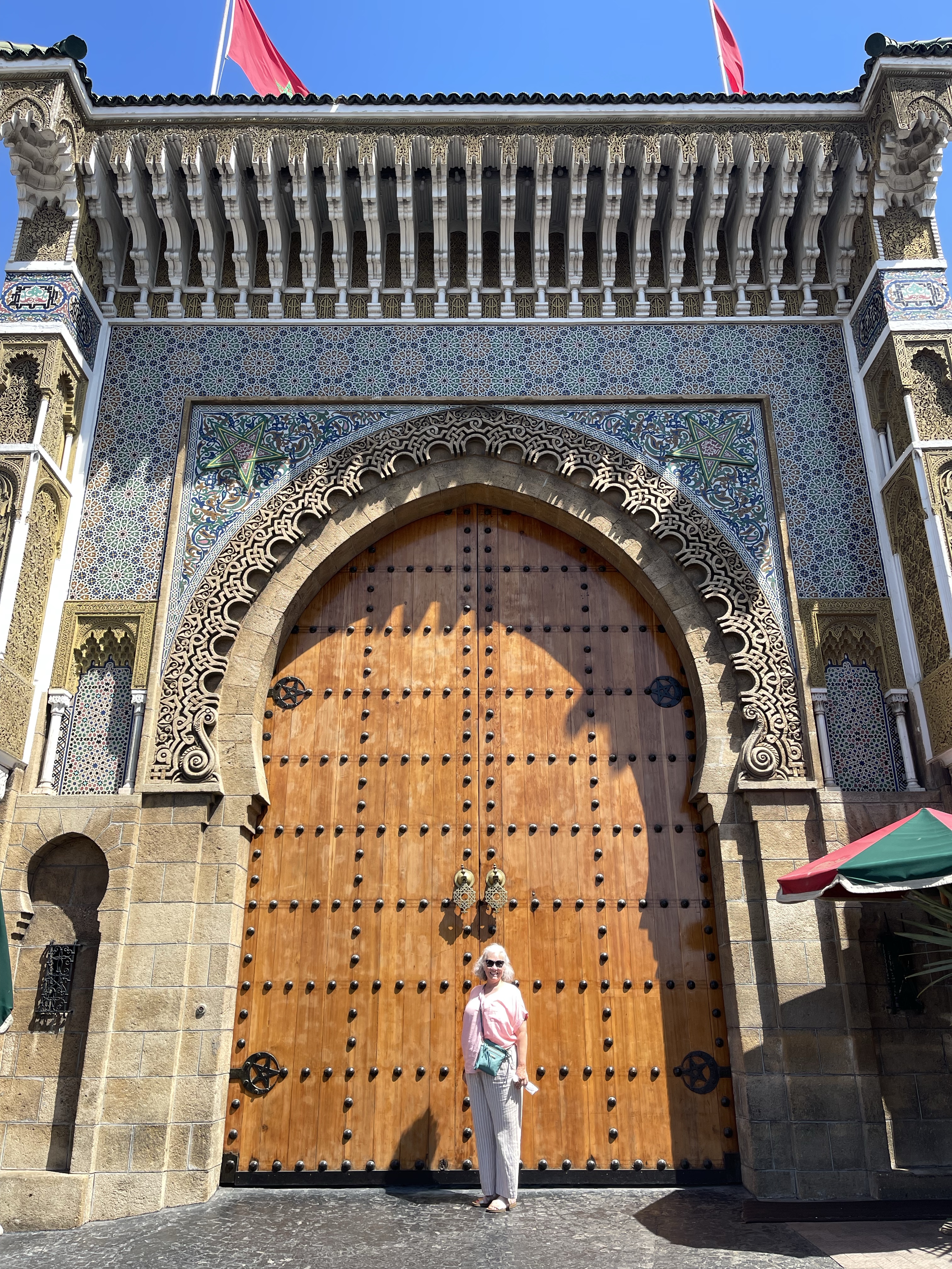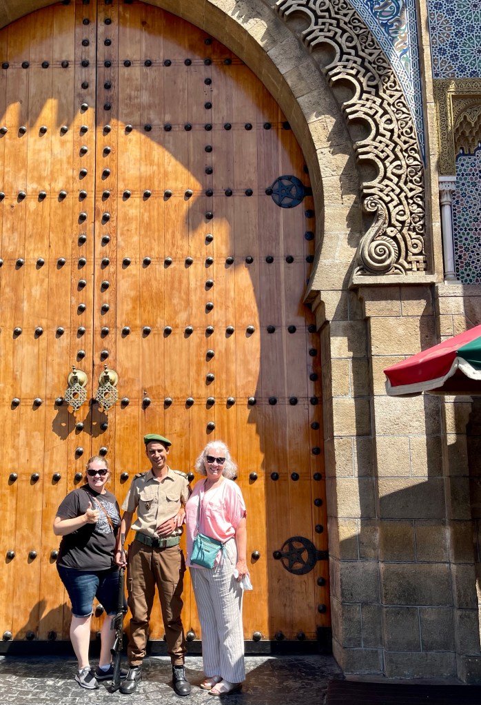 The guard demanded my phone to see if I shot a picture. I had not taken a picture, as instructed, and began what I hoped was a genial conversation. I drew attention to the Moroccan flag gracing my big toe, hoping it would build a bridge between us. It worked! He held his arm out and escorted me across the street to the gate. Since he was still in possession of my phone he took my picture. I asked if I could take a picture with the group of guards. The question illicited “NO NO NO” and more finger wagging. I was able to get another picture with he and Whitney however.